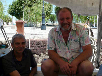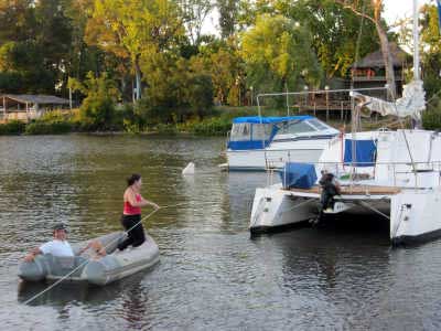 Marco a descendu son petit catamaran à Mercedes. Il s’est amarré à la bouée en attendant de venir se mettre à couple de Vent de Folie. Candice fait donc le taxi.