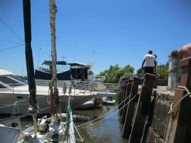 Lors de cette grande affluence de bateaux, le directeur de l’hydrographie nous a demandé de nous mettre, nous aussi, perpendiculaire au quai, l’arrière attaché à l’une des bouées.