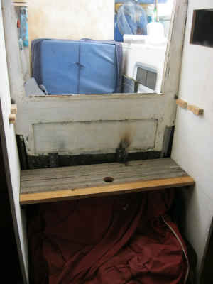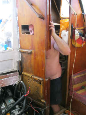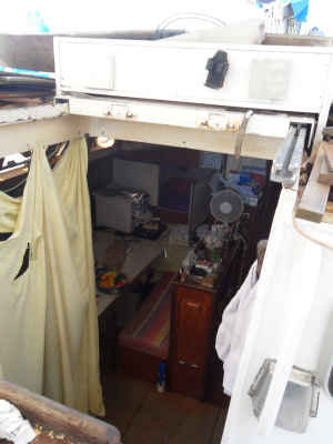 Après la cabine bâbord transformée en atelier, table à carte et poste de navigation (dont certaines finitions attendent toujours et risquent fort d’attendre encore un moment), nous commencions la réfection de la descente.