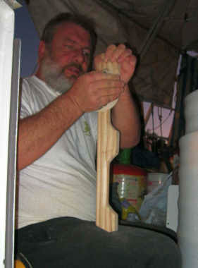 Un joli bouton en bois, en forme de grosse larme, dessiné par le second et confectionné avec doigté par notre Capitaine.