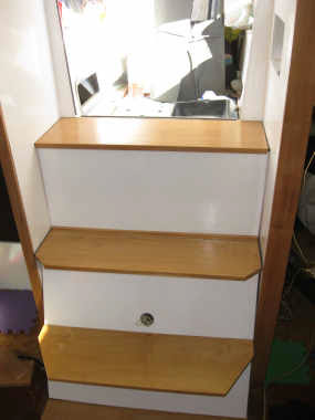 - dans la partie haute (derrière la porte indiquée sur la photo), une sorte de niche nous sert de bibliothèque.