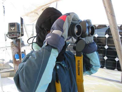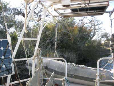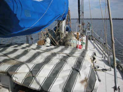 Je rappelle que notre ancien génois a explosé lors de nos 2 mémorables nuits sous Pampero (violente tempête), alors que nous faisions notre entrée en Uruguay (à La Paloma). Nous avions dû alors le remplacer par un nouveau, fort heureusement disponible à bord, mais sans protection contre le soleil – Il était grand temps que nous nous en occupions !