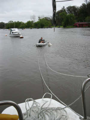 Dans l’après-midi, l’amarre qui retenait l’arrière de Vent de Folie au poteau du quai s’est soulevée et flotte au gré du courant. En soirée, ce sont celles de Tortuga (du même côté) qui partent. Oups ! Désormais, nous ne sommes retenus au quai que par nos amarres avant. Mais heureusement, toujours retenus par les bouées. Espérons juste qu’elles tiennent le coup - les amarres…et les bouées !? Car, depuis que nous avons vu Tucano dériver sur le Rio, traînant la bouée derrière lui, sachant comme ce catamaran est léger, nous n’avons pas du tout confiance. |