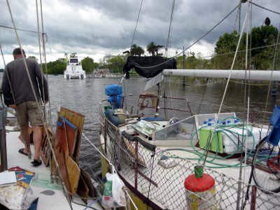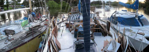 L’eau mettra encore plusieurs jours pour retrouver un niveau à peu près normal. Quant à notre moral, il descendra de plus en plus vite. Car si nous profitons du charme de ce nouvel environnement, nos travaux, eux, n’avancent pas, puisque toujours pas d’électricité à bord. |