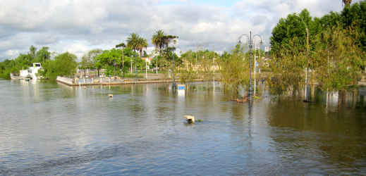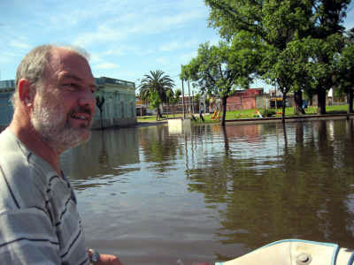 Sous prétexte d’y acheter légumes et fromage, nous grimpons chaque samedi les 5 ou 6 quadras qui séparent le port de cette feria. Nous avons alors le plaisir de papoter avec les commerçants qui tous nous connaissent – chacun ces jours-ci nous demandant « ¿ Cómo anda con la creciente ? » (comment ça se passe avec la crue ?). Nous y allons même lorsqu’il pleut. Mais ces jours là, clients et commerçants sont rares. Car les Uruguayens détestent la pluie, voire même l’idée qu’il va pleuvoir. A la moindre annonce de pluie, on ne parle que de la lluvia (la pluie). Dès les premières gouttes, plus un chat ni dehors, ni dans les magasins. Aussi, avec les pluies diluviennes de ces derniers mois, les habitants de Mercedes ne sont pas à la fête.