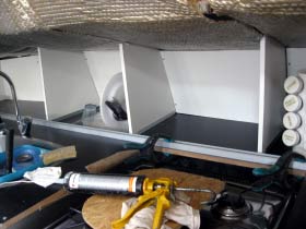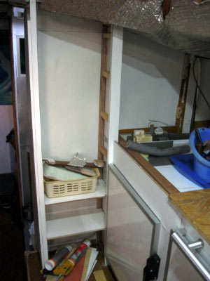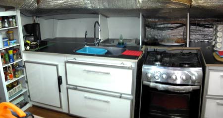 Puis fixation du bandeau supérieur et des rails dans lesquels coulisseront les portes (portes que nous n’avons toujours pas, faute de trouver le plexiglas que nous voulons en Uruguay. Nous les achèterons lors de notre prochain séjour en Argentine). |