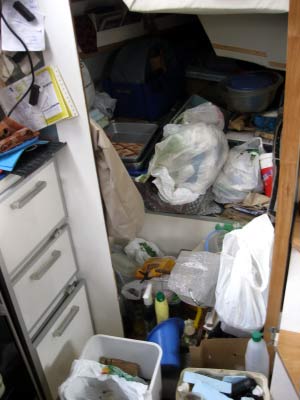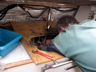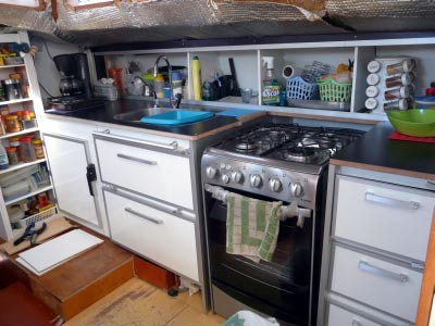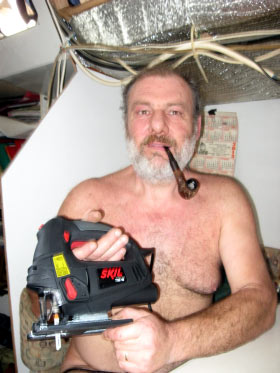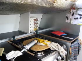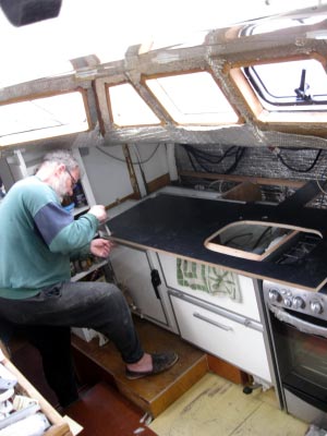 Peu à peu les différentes parties de notre futur plan de travail sont coupées et rangées dans le bateau. |