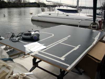 Cette planche, mélaminée sur les deux faces (noir veiné de gris - pour les petites curieuse cette fois !) mesure plus de 2m50. Là encore, impossible de la mettre sur le pont en l’état. Nous préparons rallonge électrique, scie sauteuse, sans oublier du scotch de masquage - car tracer sur du noir…bonsoir ! - et nous nous exportons une fois de plus sur le quai. |