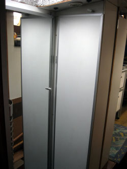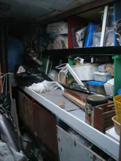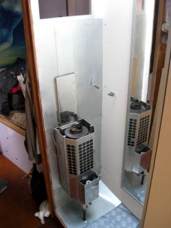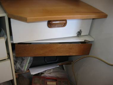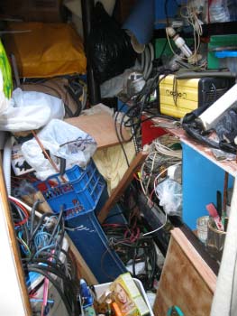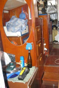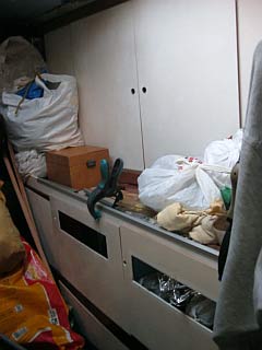 Avant l’arrivée de Candice (été austral 2012/2013), afin de mettre au plus vite un peu d’ordre dans le "foutoir" qu’était notre bateau, nous avions également fait, dans ce petit coin de la coursive que nous ne cesserons d’appeler « toilettes », 2 grands placards avec, dans des conditions pour le moins précaires (cf.page Travaux-déprime) un nombre incalculable d’étagères. |