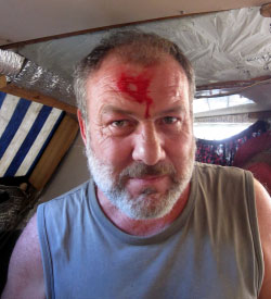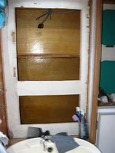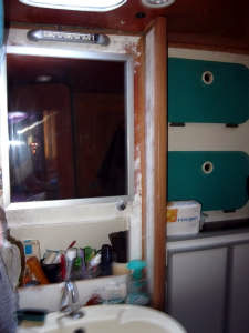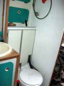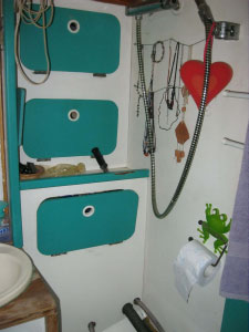 Le sol, car nous tenons (par simple sécurité, non superflue quand on connaît notre déveine !) à changer la vanne des toilettes et que cela ne peut se faire que lorsque le bateau est à sec (ou à terre). Quant au reste, au début : « ça pouvait attendre !» - maintenant : « Ras le bol ! ». Nous avons décidé de nous « remettre » de ces années de travail épuisant avant de faire ces peintures et autres rénovation dans cette salle de bain (plus d'explication en fin de page). |