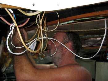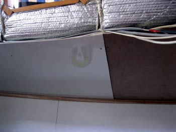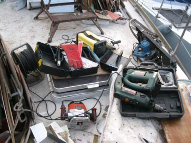Mais pour le moment, même s’il reste du boulot, Nous nous contenterons de terminer ce qui est commencé, soient les plafonds et vaigrages, afin d’avoir un carré « qui ressemble à un carré ». Mais aussi, pour en finir avec ces matériaux qui encombrent la coursive, le carré, la cabine arrière et l’avant – nous nous demandons parfois comment nous avons pu garder notre lit ! Nous terminerons également ce qui est essentiel à la navigation et au bon fonctionnement du bateau.. |