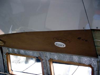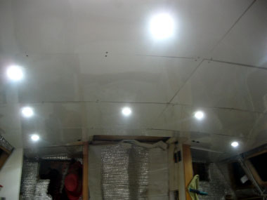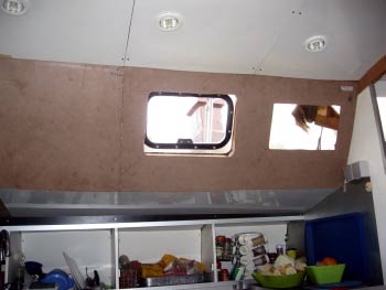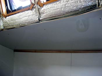 Début juin – les plafonds principaux du carré sont terminés. Ceux sous les passavants (plafonds bas sur la banquette et la cuisine), ainsi que les vaigrages des hublots attendront encore quelques mois… |
