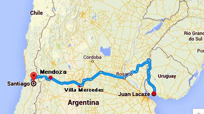 10 heures – le bus pour Mendosa démarre. Durée prévue entre Montevideo et Mendosa : 24 heures. Nous revenons sur nos pas et passons non loin de Juan Lacaze (il en est ainsi, hélas !). 2 heures plus tard, nous approchons de Mercedes qui se trouve être sur la route Montevideo/Mendosa. Petit coucou en passant à cette jolie ville où nous aurons passé une grande part de cette dernière décennie. Petit coucou deviendra grand… Alors qu’aucune limitation ne l’y oblige, le bus roule de plus en plus lentement. Puis il ralentit…ralentit… ralentit encore… STOP ! Tout le monde descend sur le bas côté. Nous attendons patiemment que les chauffeurs réparent. Il est midi. Il fait un soleil de plomb. Pas un arbre à l’horizon. Nous repartons… 2 heures plus tard. C’est fichu pour notre correspondance Mendosa-Santiago demain matin ! |