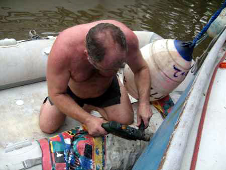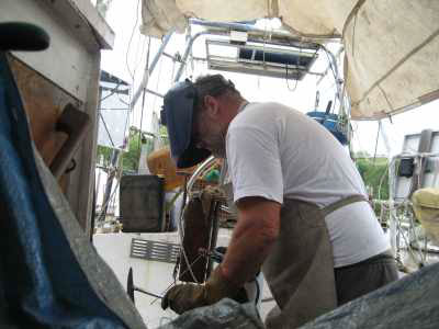 Depuis notre retour de voyage, nous cherchons désespérément un soudeur qui veuille se donner la peine d’exercer son métier. En attendant, nous nous sommes attaqués à la rouille qui commence à ronger |