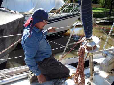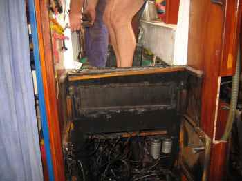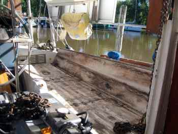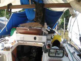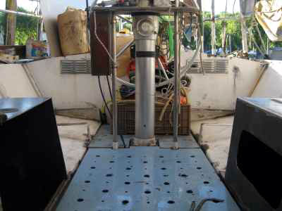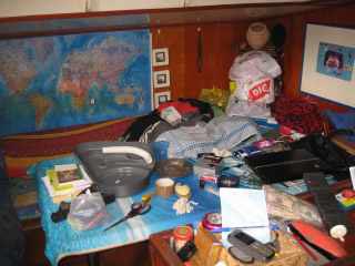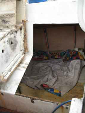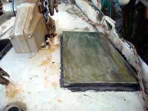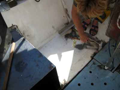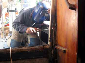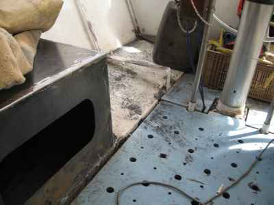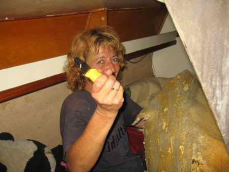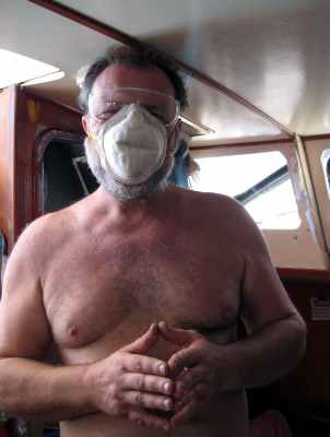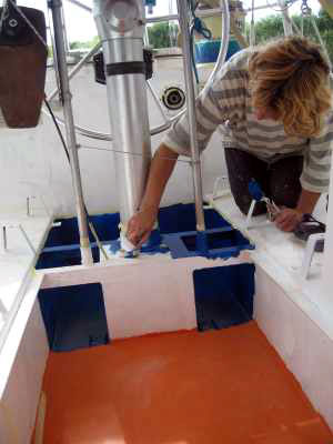 Dehors comme dedans, malgré les "scotchs" et protections diverses, la limaille noire s’est infiltrée partout et je préfère ne pas penser au rangement futur. Mais nous retrouvons un peu de calme à bord et pouvons attaquer les multiples couches de traitement et peinture du cockpit, en tenant compte des allers et venues du mécanicien, ainsi que du menuisier qui doit prendre les mesures des nouveaux bancs. |