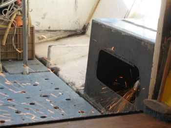 Rémy, prudent, s’occupe de la découpe des nouveaux hublots.