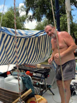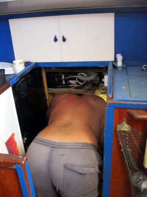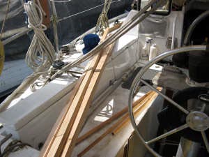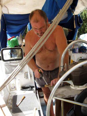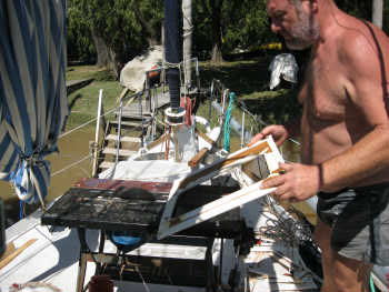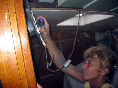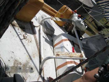 Entre autres, la tôle du pont étant à nue, nous en profitons pour superviser tout ce qui la traverse et refaire quelques fixations qui laissaient largement à désirer et provoquaient des entrées d’eau.