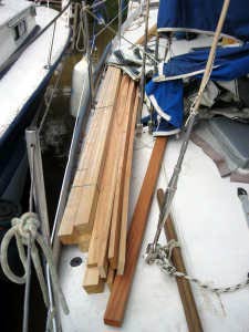 Une dizaine de poutres et tasseaux de 2 mètres 50 de long attendent sur le pont.