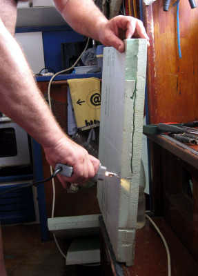 Puis, grâce à une petite transformation maison de notre fer à souder, nous recoupons les plaques d’isolant afin de les insérer dans ces tasseaux.