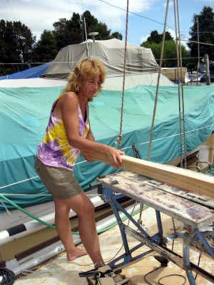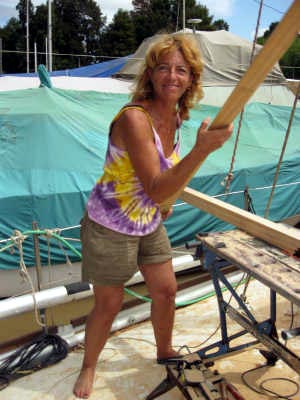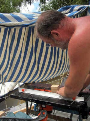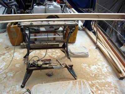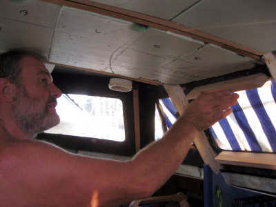 Le boulot que nous allons entreprendre maintenant nous vaudra des heures et des heures de réflexion, de remises en question, de calculs, de coupes et recoupes, de joint Sika noir plein les ongles, de bras ankylosés à force de tenir ces fichus "morceaux de bois" en attendant qu’ils daignent tenir seuls autour des hublots.
