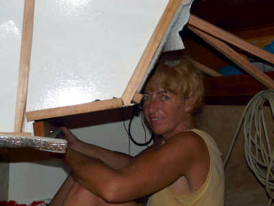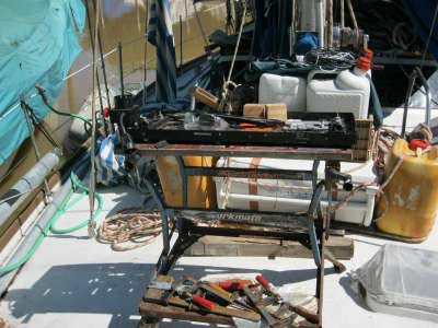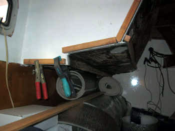 Notre atelier se situait jusqu’alors dans la pointe avant. Loin du moteur, difficile d’accès en navigation et pas très pratique, nous avons décidé de le transporter à l’arrière, dans notre cabine "amis - garage - grenier - cave - atelier".