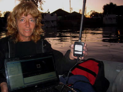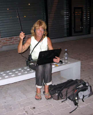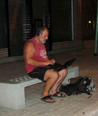 Nous sommes sur notre banc, l’ordinateur sur les genoux, l’antenne levée à bout de bras, parlant à haute voix à notre écran, en Français…
