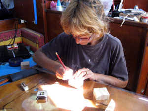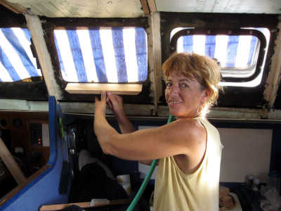 Après chaque coupe, le pont est couvert d’une épaisse couche de sciure que nous tentons de balayer avant qu’elle ne s’infiltre à l’intérieur par les ouvertures. Mais c’est peine perdue.