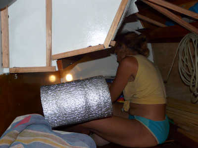 Pour l’instant, nous commencerons, là encore, par coller des tasseaux sur la paroi en acier puis isoler le côté cockpit qui ne l’était pas vraiment, notamment après les transformations faites l’an dernier sur les bancs du cockpit et donc le plafond des cabines.