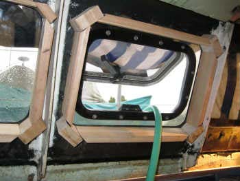 Avant de procéder à l’isolation des hublots du carré (ce qui n’avait jamais été fait, laissant ainsi passer froid ou chaleur et provoquant des coulées d’eau le long de l’acier), nous devons tout d’abord faire un encadrement en bois sur chacun d’eux afin de masquer la couche d’isolant de 5 cm d’épaisseur entre le hublot et le vaigrage.