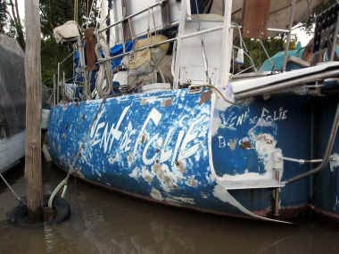 Comme ce cher homme ne sort son bateau du club qu’environ 4 fois par an (ce qui est beaucoup comparé aux autres propriétaires, diraient les mauvaises langues !), Rémy saute dans l’annexe pour poursuivre ponçage, masticage et traitement de la coque sur bâbord.