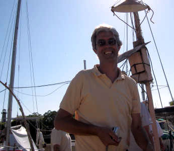 Et, toujours en grande discussion, voici Joël, qui navigue sur Bigoudi.