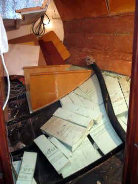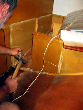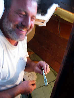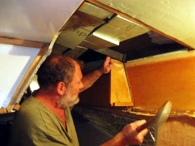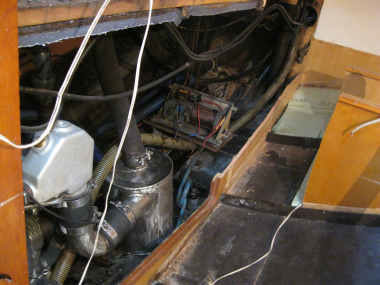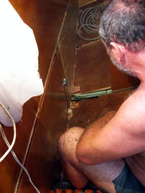 Nous nous "attaquons à" faire tomber l’énorme planche qui sépare le moteur de la cabine. Celle-là même qui imposa tant de contorsions à notre Capitaine.