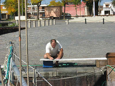 Le quai où sont amarrés les autres voiliers est plus haut que le nôtre.
