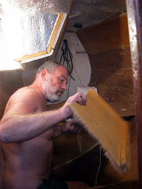 Nous préparons des cloisons entre le moteur et le reste de la cale. Celles-ci seront amovibles et doublées de ces énormes plaques d’isolant phonique qui envahissent la cabine de Candice.