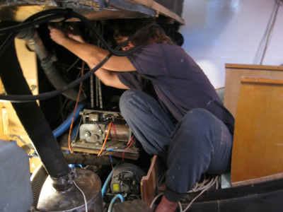 Puis Rémy s’empresse d’enlever tous les câbles et tuyaux inutiles ou pouvant passer ailleurs que dans cette cale moteur.