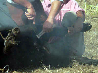 Un cavalier, « el dueño » (le patron), du haut de sa monture, se saisit alors d’un fer chauffé et l’apporte à ses gauchos.
